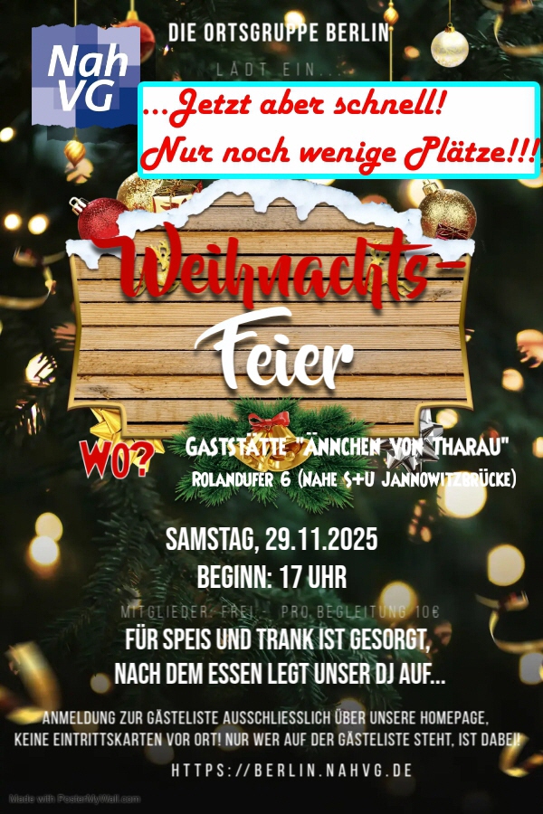 Für alle, die sich und Begleitung angemeldet haben: am 29.11. ab 17 Uhr steigt unser Event. Bitte denkt an euren Mitgliedsausweis, es wird am Einlass kontrolliert. Ebenso wird bei Gästen, welche in Begleitung eines Mitglieds kommen, und angemeldet wurden, vor Ort die Pauschale von 10 Euro in bar kassiert.