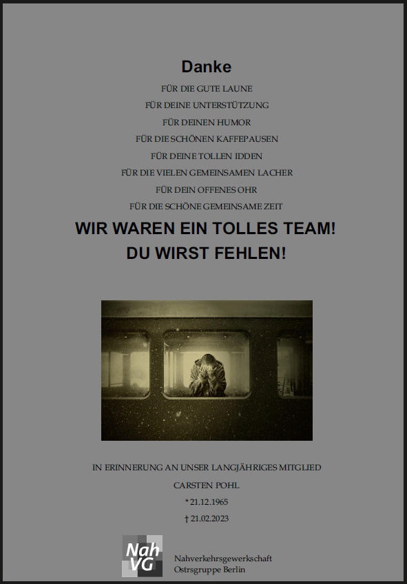 Da uns von Seiten der BVG mitgeteilt wurde, dass weder eine Teilbetriebsstillegung oder generelle Betriebsstillegung erfolgen wird, und sich die dbb Tarifunion mit ihren Verhandlungspartnern noch vor der ersten Verhandlungsrunde mit dem Kommunalen Arbeitgeberverband befindet, welche am Dienstag, 28.1.2025 stattfinden soll, gilt für den angekündigten Warnstreik am Montag 27.1.2025 für die Mitglieder der Nahverkehrsgewerkschaft folgende verbindliche Verfahrensweise: