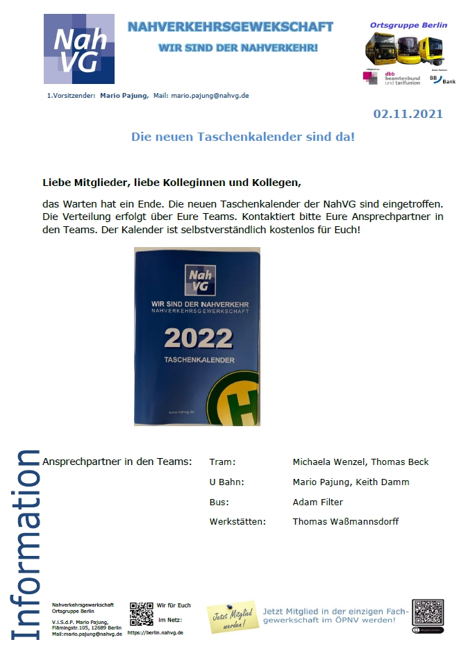 das Warten hat ein Ende. Die neuen Taschenkalender der NahVG sind eingetroffen. Die Verteilung erfolgt über Eure Teams. Kontaktiert bitte Eure Ansprechpartner in den Teams. Der Kalender ist selbstverständlich kostenlos für Euch!