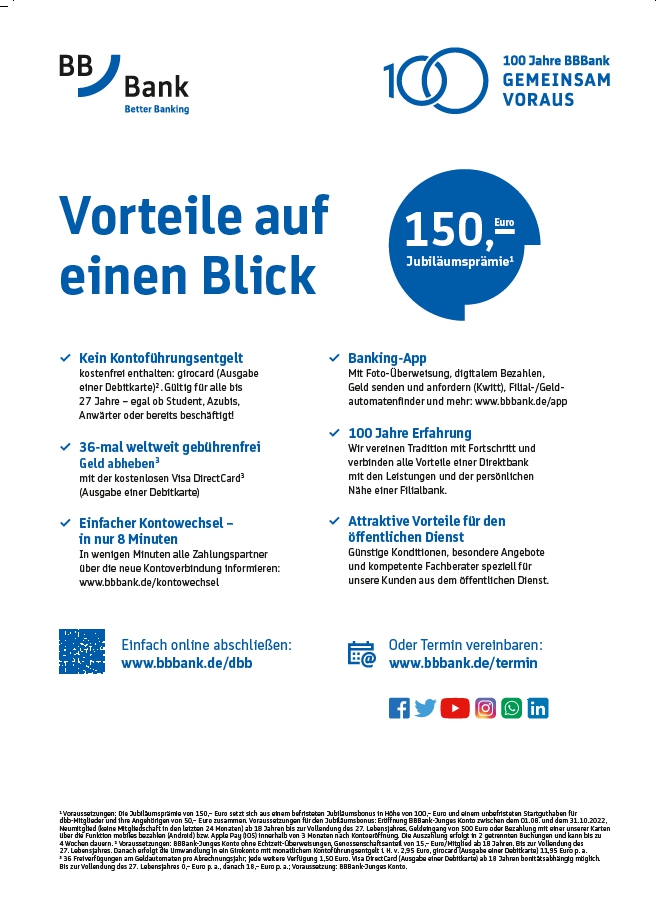 Vom 01.08.22 - 31.10.2022 schenken wir jungen Kolleginnen und Kollegen bis 27 Jahre 100 € Startguthaben bei Eröffnung des BBBank Jungen Kontos.
