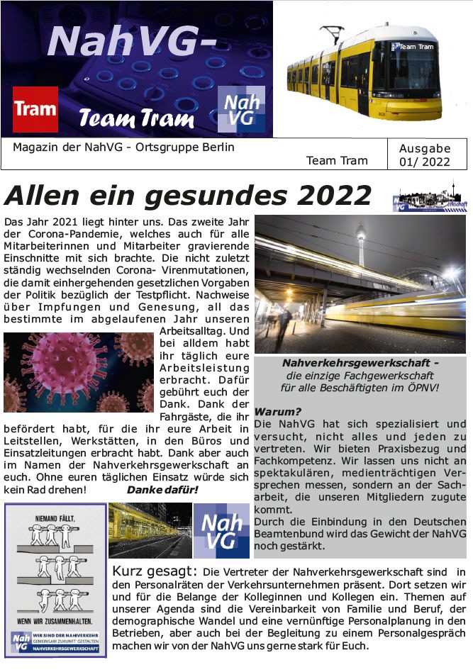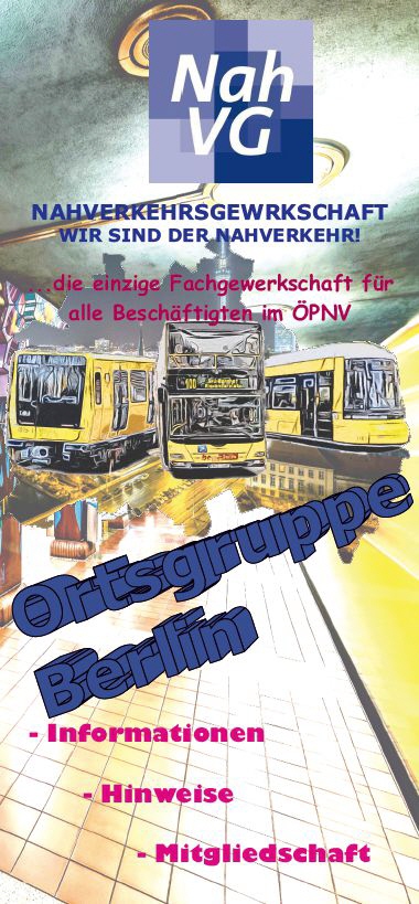 Die Ortsgruppe Berlin hat deue Flyer in Auftag gegeben. Jeder, der sich über unsere Fachgewerkschaft informieren möchte, über Vorzüge, Mitgliedsbeiträge und eine starke Gewerkschaft, findet alle Infos in unserem neuen Flyer. Er liegt auf den Betriebshöfen aus, oder, wenn vergriffen, dann hier zum Nachlesen als pdf: