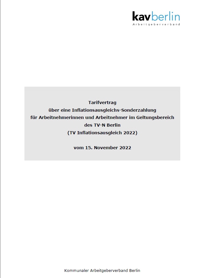 Die dbb Tarifunion, unser Verhandlungsführer in allen Tarifangelegenheiten, hat mit dem Kommunalen Arbeitgeberverband KAV für die Beschäftigten bei BVG und BT einen Abschluss über eine Inflationsausgleichszahlung erreicht. Mit dem Dezembergehalt erhalten die bezugsberechtigten Vollzeit- Beschäftigten eine steuerfreie Inflationsausgleichspauschale von bis zu 1500 Euro. Mitarbeitende in Teilzeit bekommen ebenso eine steuerfreie Inflationsausgleichspauschale, jedoch mit Abzügen. Genaue Aufschüsselungen könnt Ihr dem Tarifvertrag entnehmen.