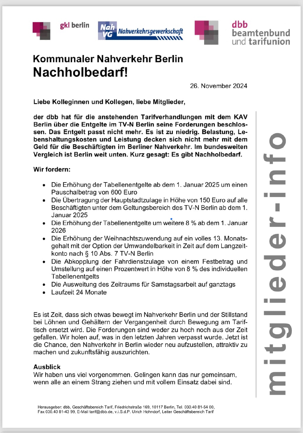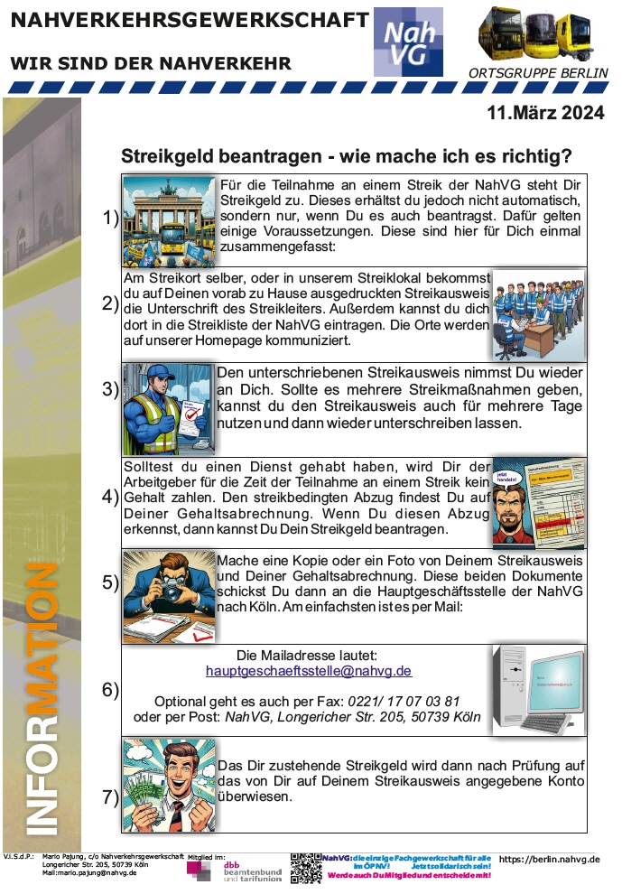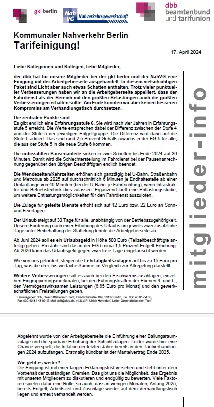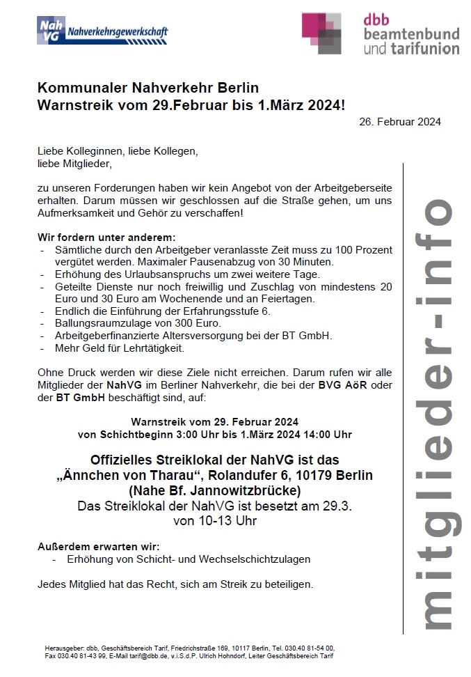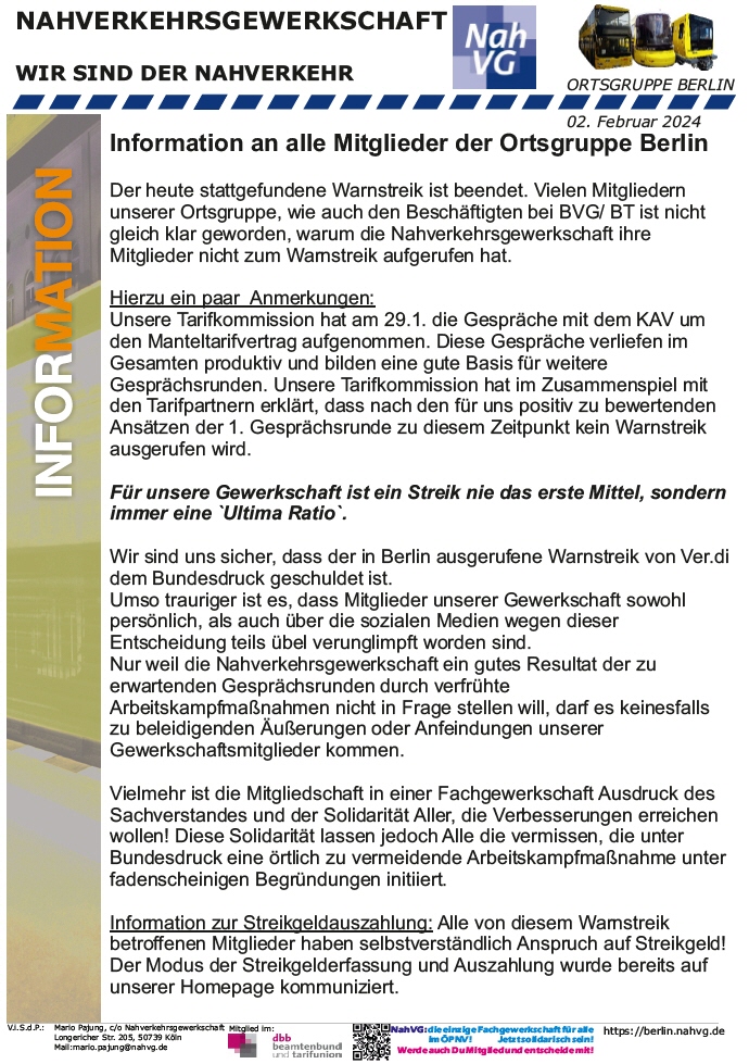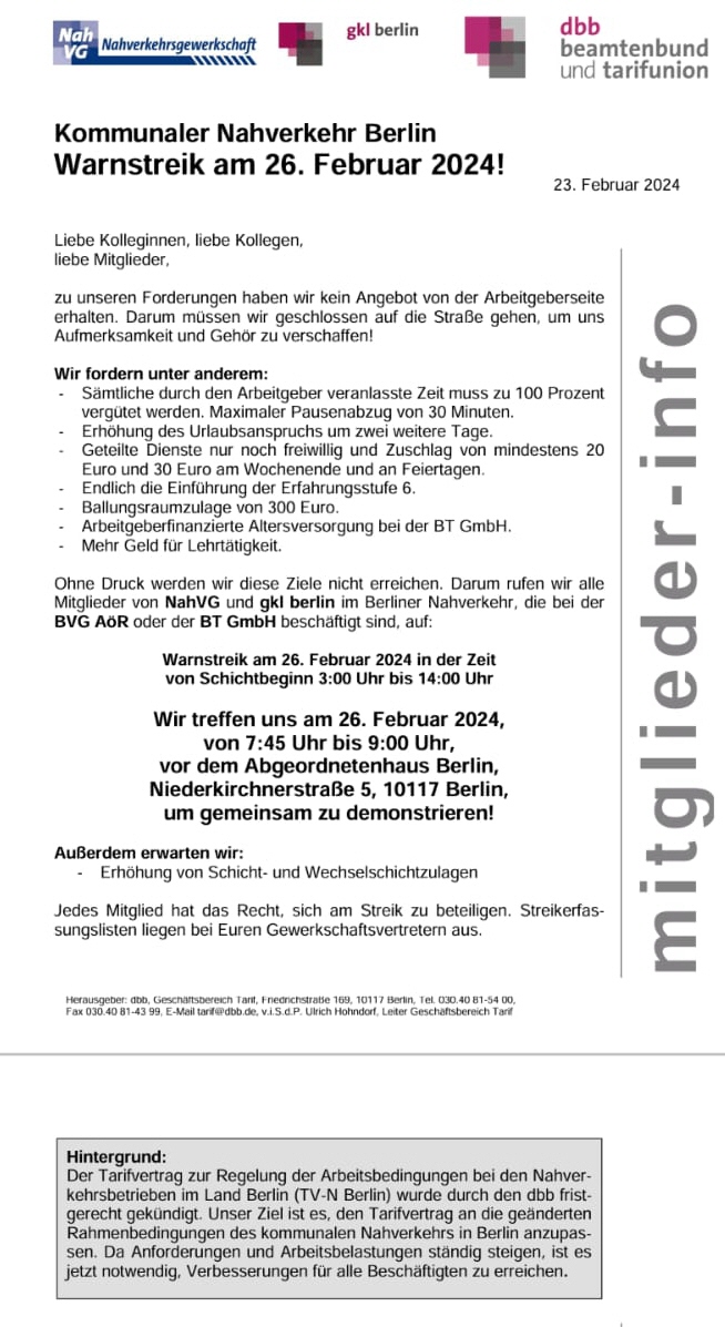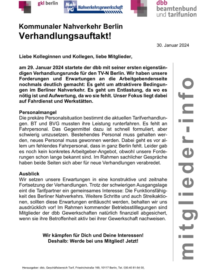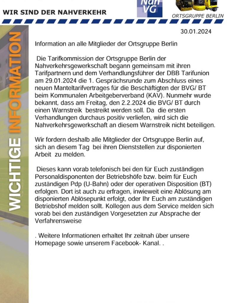Wichtige Informationen für alle Mitglieder der Nahverkehrsgewerkschaft Ortsgruppe Berlin