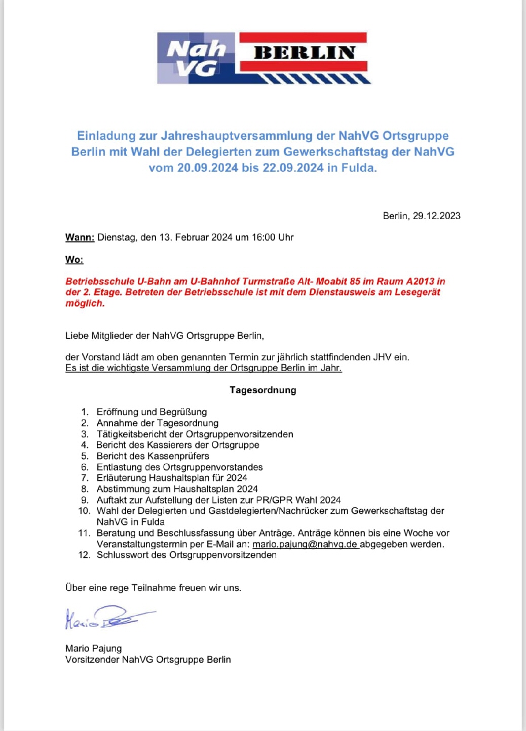 Am 13.2.2024 fand die Jahreshauptversammlung der Ortsgruppe Berlin der Nahverkehrsgewerkschaft statt. Als Gast konnte der langjährige Vorsitzende der OG Berlin und jetzige stellvertretende Bundesvorsitzende der Nahverkehrsgewerkschaft Mathias Ruppelt begrüßt werden. Er übermittelte Grüße und Dank des Vorstandes der NahVG. Die Mitglieder der Ortsgruppe baten Mathias Ruppelt, seinen Vorstandskollegen ebenso herzliche Grüße zu übermitteln, verbunden mit den besten Genesungswünschen für den Bundesvorsitzenden Axel Schad.