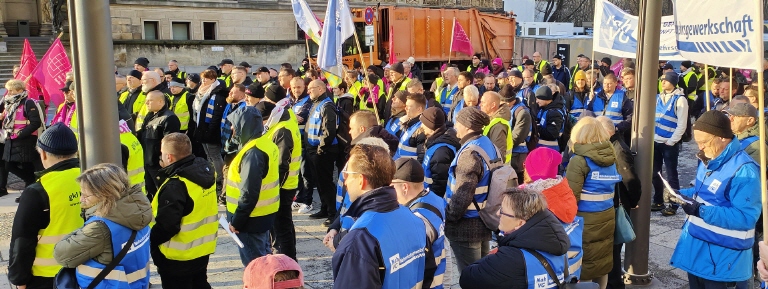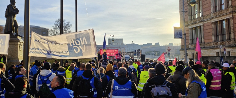 der von der dbb Tarifunion für seine Mitgliedsgewerkschaften angekündigte Warnstreik bei der BVG/ BT ist um 14 Uhr planmäßig beendet worden. Im Rahmen des Warnstreiks fand die zentrale Kundgebung vor dem Abgeordnetenhaus Berlin statt. Als Redner forderte Volker Geyer, stellvertretender Bundesvorsitzender des dbb und Fachvorstand Tarifpolitik von den Verhandlungspartnern sofortige verhandlungsfähige Angebote seitens des KAV, sowie die sofortige Terminierung für eine zweite Verhandlungsrunde.
