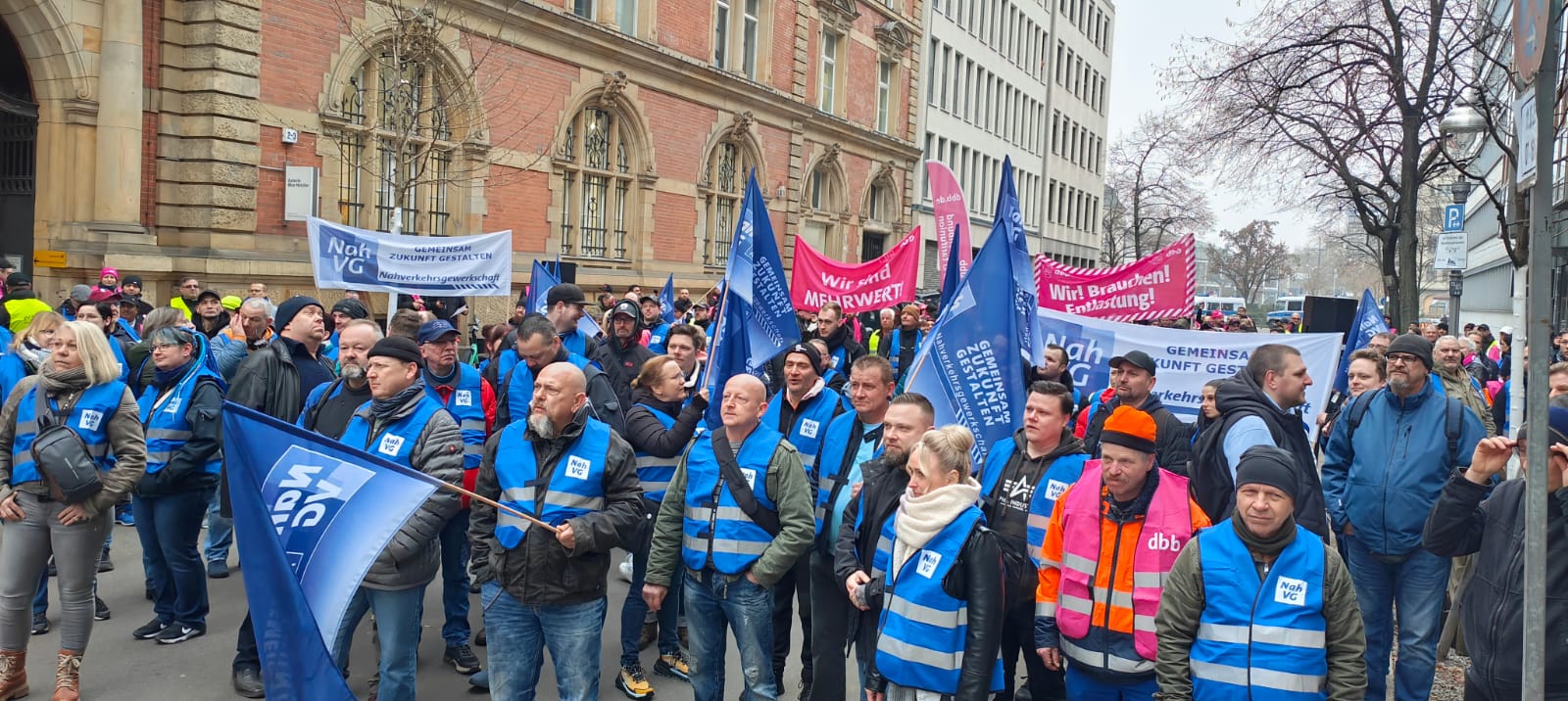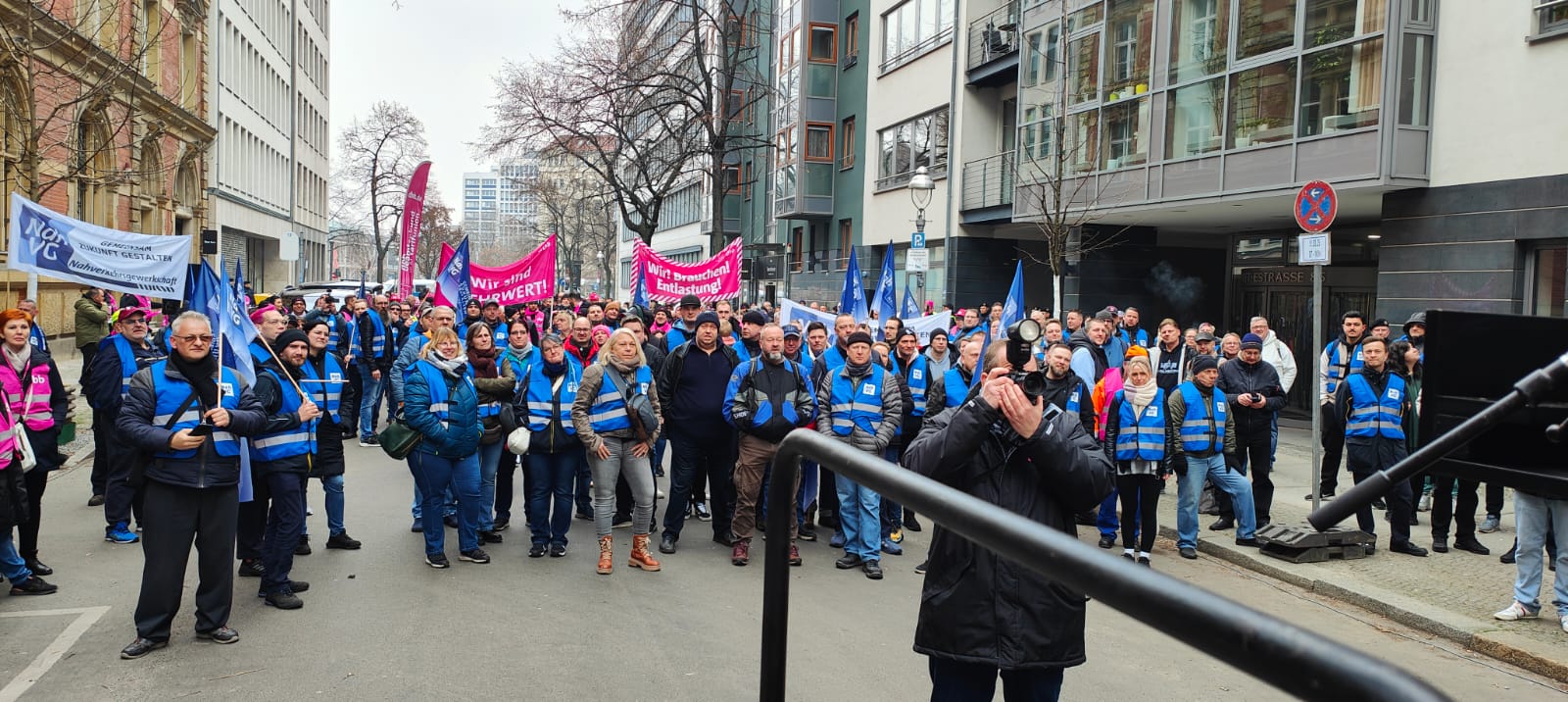 Am 11.3.2025 hat die NahVG ihre Mitglieder aufgrufen, die BVG und BT für 24 Stunden zu bestreiken. Gleichzeitig erging die Einladung zur Streikkundgebung vor dem Haus des Kommunalen Arbeitgeber Verbandes (KAV). Der KAV, so betonten die Redner in ihren Worten, zeigt mit seiner Blockadehaltung, die Verhandlungspartner im dbb an den Tarifgesprächen zu beteiligen, einen falschen Weg auf. Lediglich zur Auftaktrunde am 28.1. wurden unsere Vertreter zu Gesprächen eingeladen.